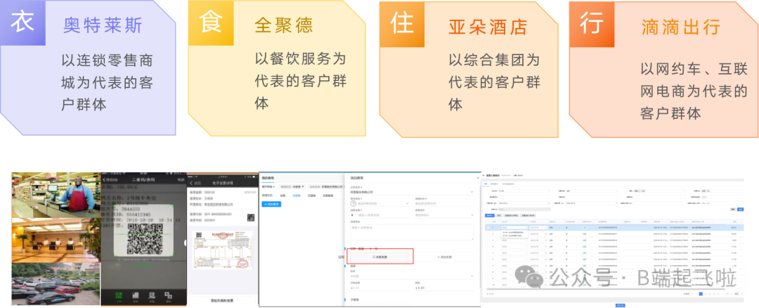如下图所示,对于发票系统来说,客户群体既有奥特莱斯、全聚德、亚朵酒店、滴滴出行这类B端企业,也有在这类场所消费的消费者。