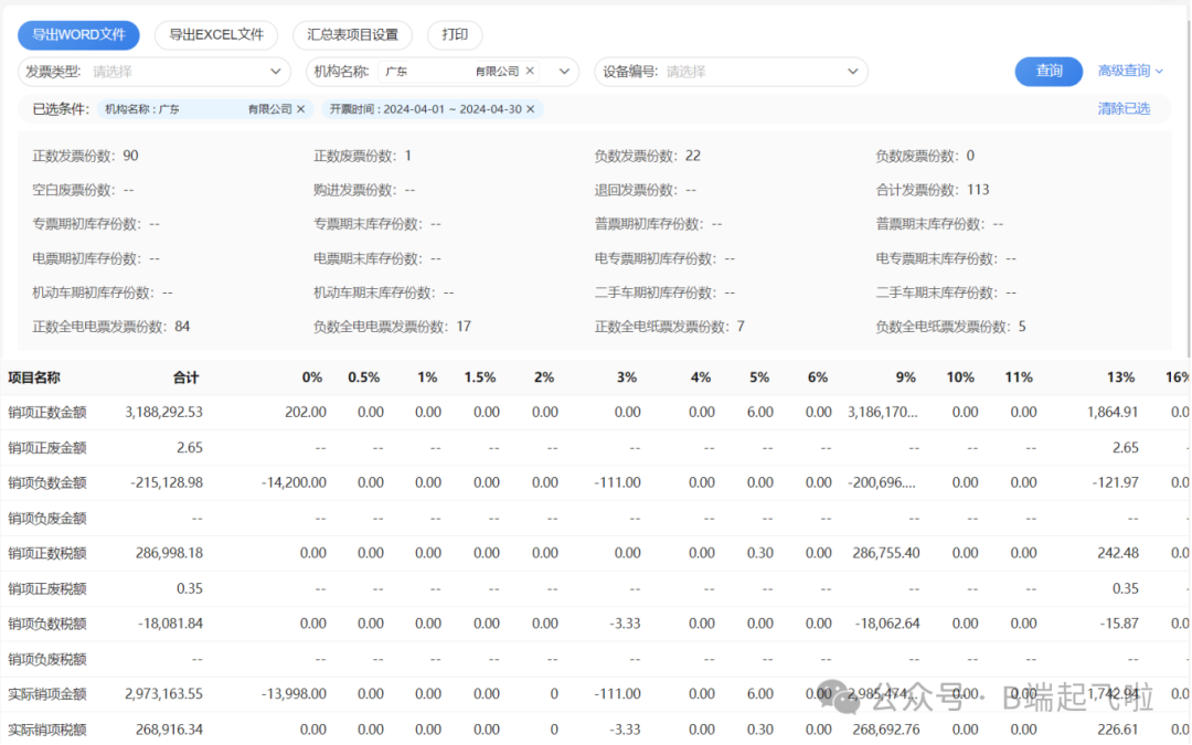 其中发票汇总,一般是分税率对金额、税额进行汇总,如下图所示: