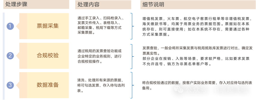 真正进入用票池的发票数据,是需要经过数据清洗、处理和分类的,即数据准备 阶段。比如将合规校验通过的数据,按客户实际业务需要,存入对应待勾选列表备用。