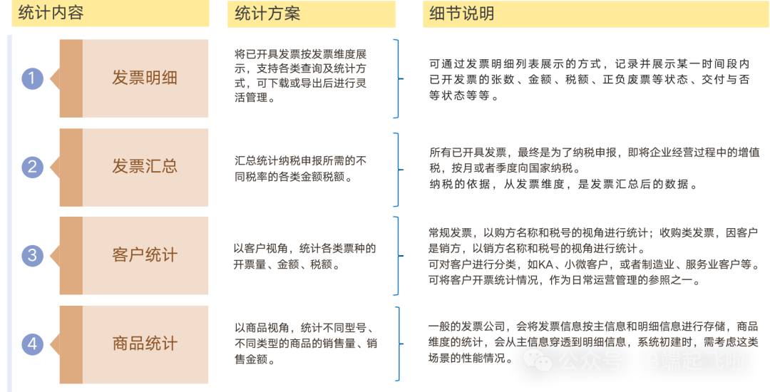 总结来说,常见的开票流程如下图所示,无论是线下通过Excel、邮件还是系统间进行数据处理和数据流转,开票时,都需要经过数据准备、业务加工、票税加工、合规校验、发票开具、发票交付几个流程。大多数企业都是有数据统计诉求的,只是不同类型的企业,统计的点和深度不一致,下图举了几个简单的例子。