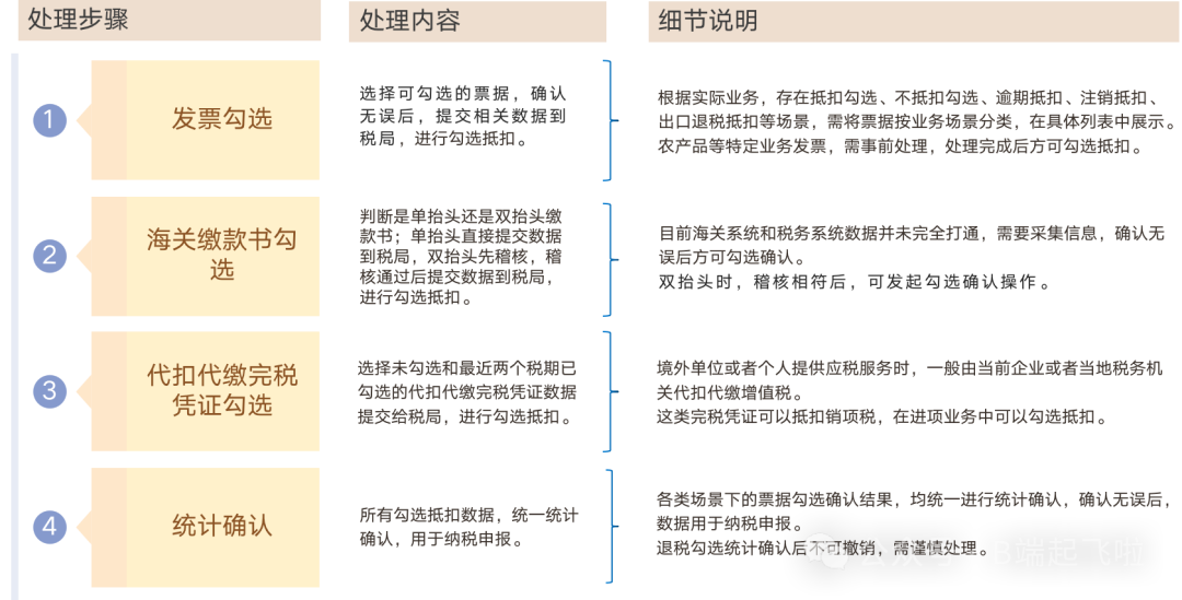 数据准备完成后,可以发起正向或逆向的票据勾选确认 流程,包括票据勾选、统计确认等,相关的主要业务操作包括: