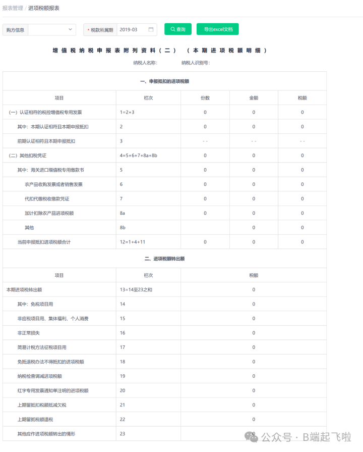 其中用票系统可以为申报表<附表二>提供数据,自动计算当期可抵扣的各税率的进项申报金额、税额等信息,如下图所示。