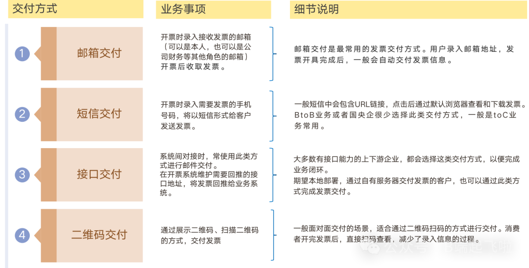 发票开具完成后,需将其交付给企业或者消费者,常见的交付方式包括:邮箱交付、短信交付、接口交付、二维码交付等。