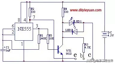 LED1、LED2、R5作为被测三极管C、b极电源电压,555的放电端⑦脚连接于被测管e极。设LED1为红色,LED2为绿色。当测量NPN型三极管时,红色发光管闪烁,说明管子是好的。