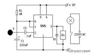 成电路IC1是一片555定时电路,在这里接成单稳态电路。平时由于触摸片P端无感应电压,电容C1通过555第7脚放电完毕,第3脚输出为低电平,继电器KS释放,电灯不亮。