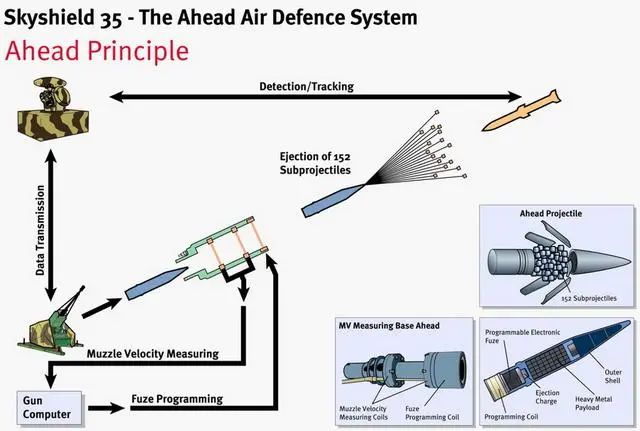 瑞士的欧瑞康(厄利孔)天盾防空系统的35mm速射炮采用编程引信。大概原理是雷达不断跟踪目标并计算出射击诸元使速射炮瞄准,另外计算出的目标距离由炮口线圈传输给出膛的炮弹。每一发出膛的炮弹都根据计算机设定的参数起爆,这样就大大增加了对目标的拦截概率。