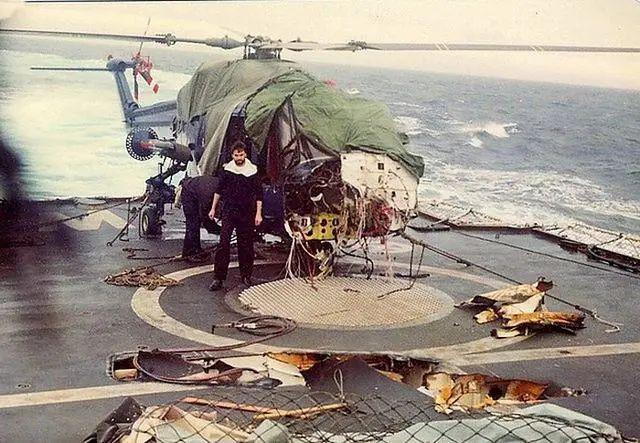 英国大刀号护卫舰被阿根廷未爆航弹砸穿的直升机甲板和砸烂机头的山猫直升机