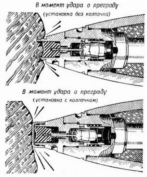 KTM-1引信内部结构复杂许多,有击针,发火和保险装置等。以下图简单说明一下它的作用原理。上为瞬发模式,发射前需要拧去头部盖子,弹头撞击目标,里面的击针后退撞击发火装置引爆。下为延迟模式,发射前保留盖子,弹头撞击目标后由于前面盖子的遮盖,不会后退。而发火装置在惯性作用下前冲主动碰撞击针引爆,这样就比击针后退会有一个小延迟,可以让炮弹侵彻目标后爆炸。KTM-1的保险装置是依靠炮弹发射时的加速度来解除,炮弹的另外一种解除保险方式是依靠在炮膛内旋转的离心力来实现。