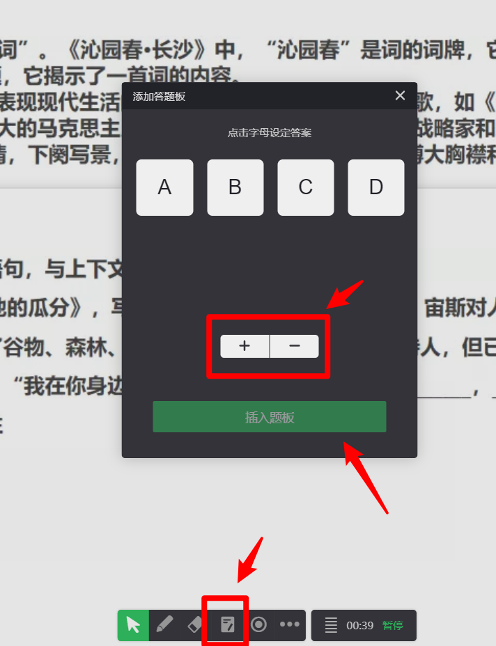 操作也很简单,在备课中插入题库中的习题或是自己编制的习题。开启知识胶囊录制,在录制中插入答题板,设定正确答案即可。