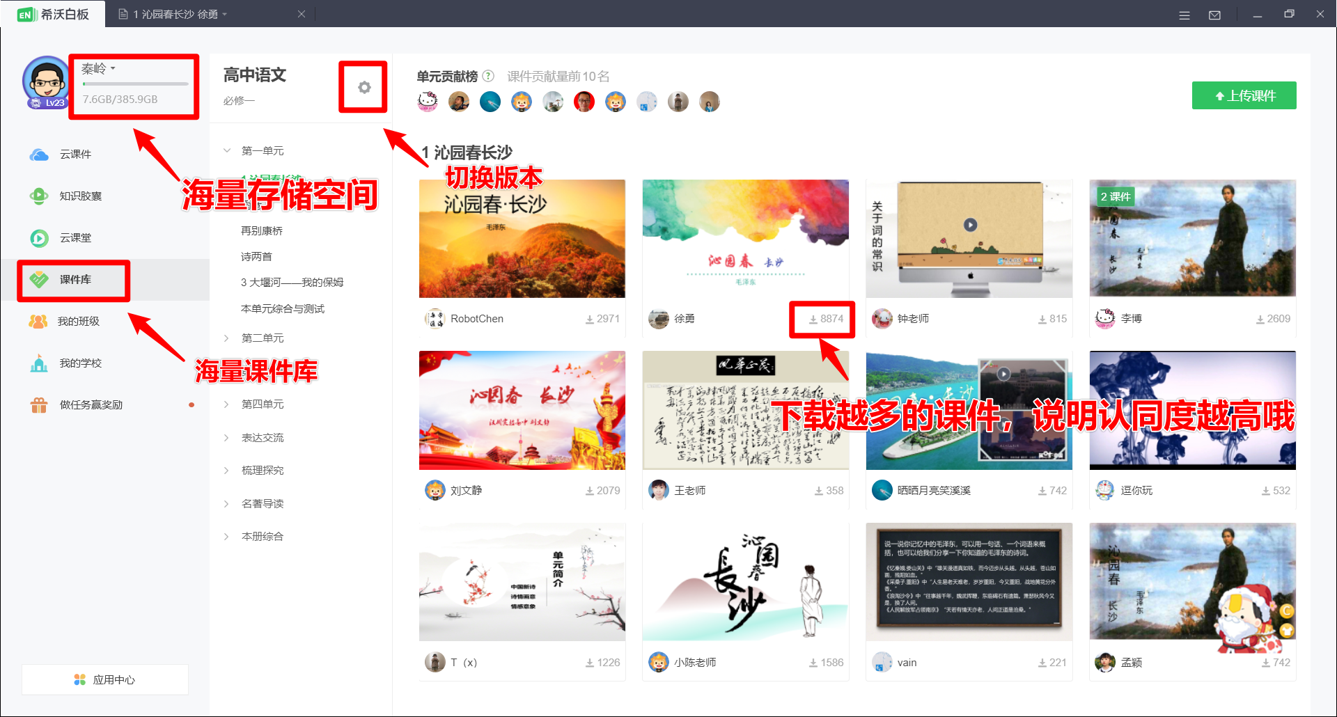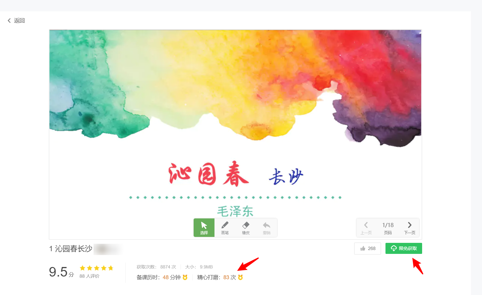 操作也很简单,直接点击课件库,选择学科和相应单元,即可找到全国老师们分享的各类课件(比某度的收费文库真的良心太多了!!!),点击“限免获取”即可保存到自己的云课件进行二次编辑。