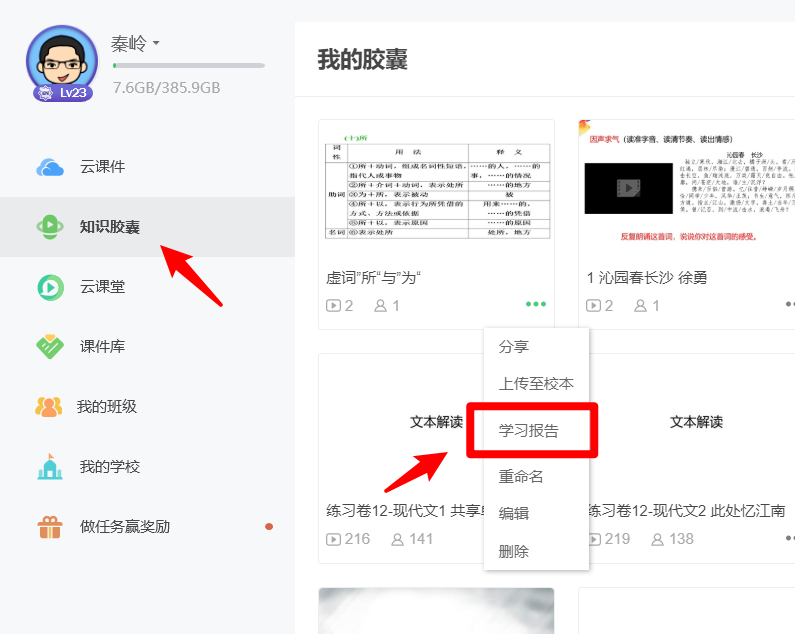 而教师可以在希沃白板-知识胶囊-学习报告中查看学生观课的具体情况。