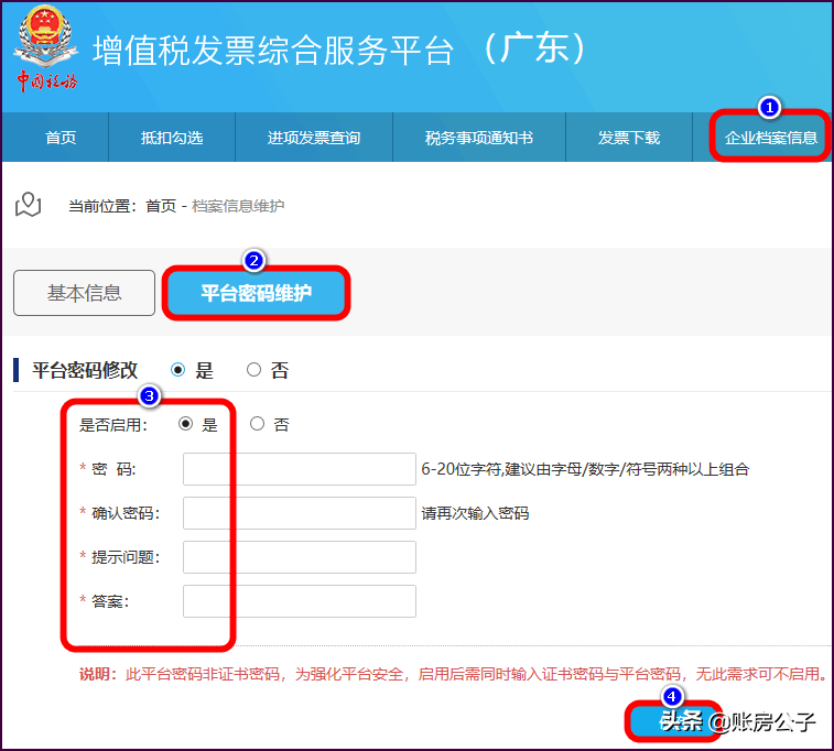 1、登陆进入增值税发票综合服务平台,点击企业档案信息 →平台密码维护 →是否启用选择是 →输入2次密码 →密保问题 →保存 。