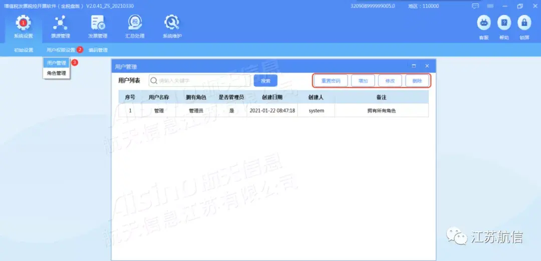 管理员可以为所有开票人重置密码,也可以对开票人进行增加、修改、删除操作。