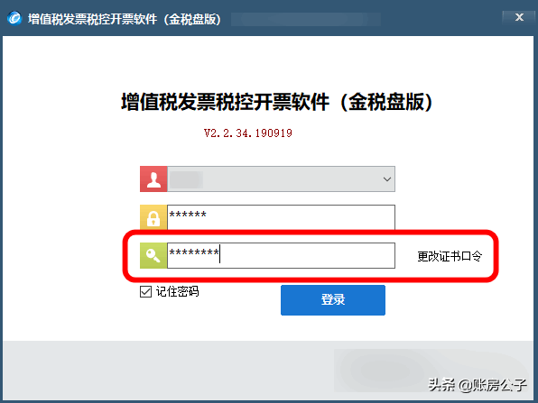 “登录密码”和“证书密码”都是税盘的密码,那么税盘的密码是多少呢?这个税盘的密码就是开票系统上的证书口令。