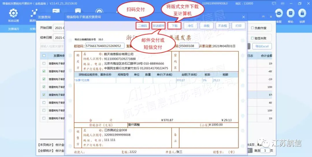 开具电子发票后,可以在发票查询界面中下载、交付。
