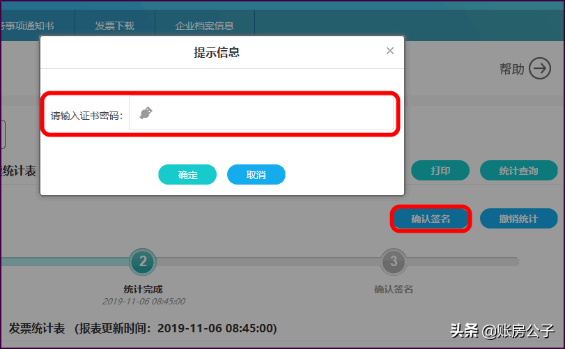 第二个密码:证书密码 ,这个密码在确认统计的时候,需要输入,此密码和登录密码是一致的,也是税盘的密码 。