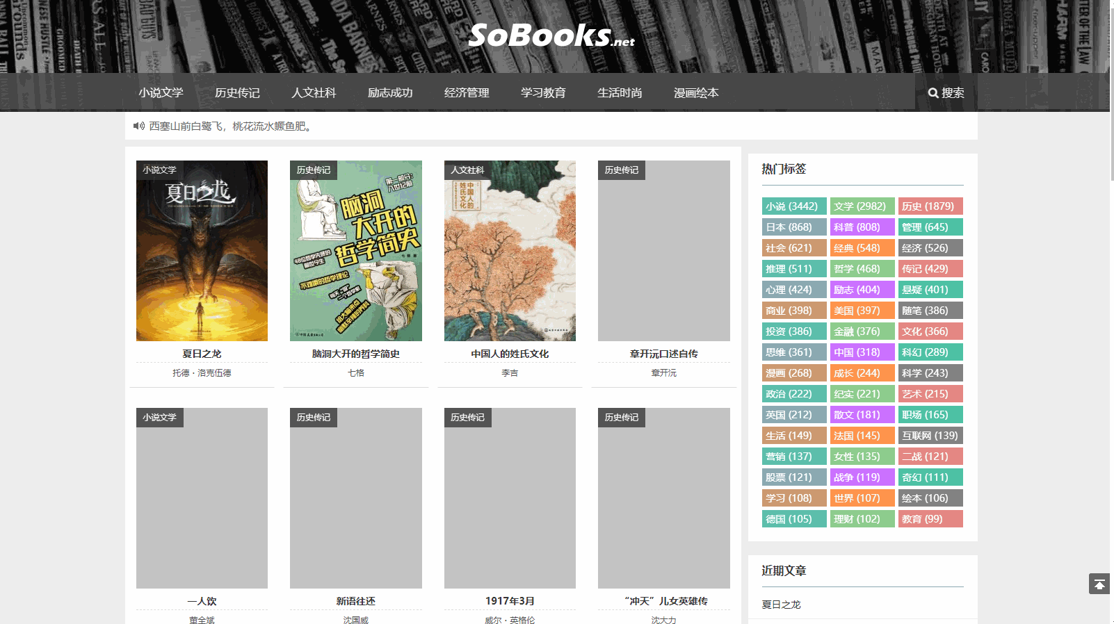这是一个优质免费电子书下载网站,网站书籍分类包含小说文学、历史传记、人文社科、励志成功、经济管理、学习教育等各大板块,而且网站很贴心地做了很多内容标签,总能淘到你需要的书籍。