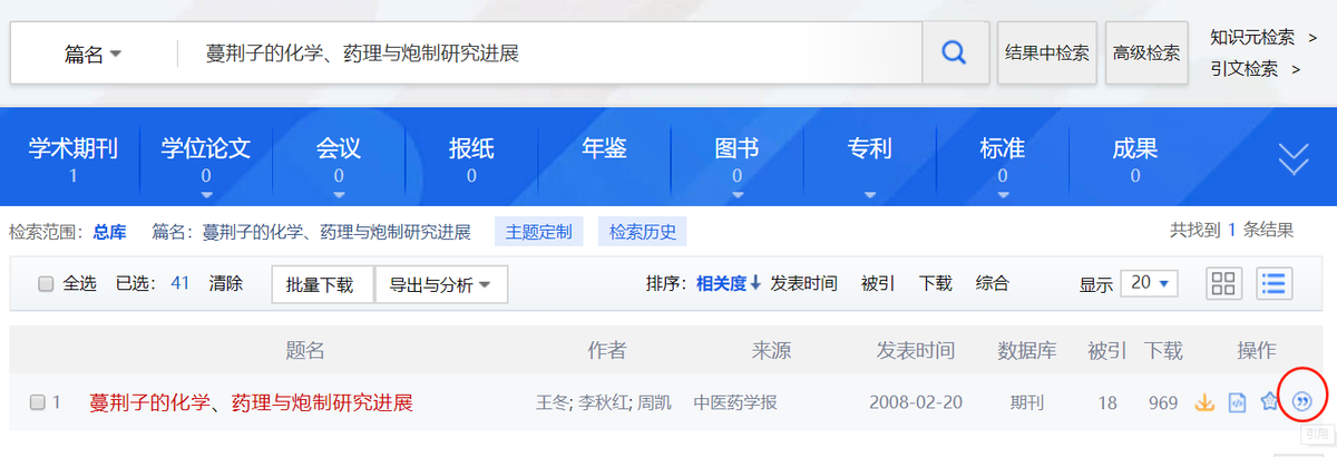 点击目标文献最右侧的操作按钮下的“引用”按钮,即可弹出参考文献的格式,我们可以直接复制使用。