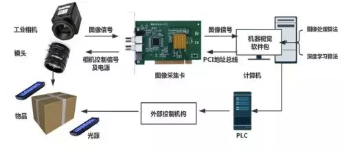 工业机器视觉系统构架主要分为硬件设备和软件算法两部分,其中硬件设备主要包括光源系统、镜头、摄像机、图像采集卡和视觉处理器;软件包中核心算法主要包括传统的数字图像处理算法和基于深度学习的图像处理算法。