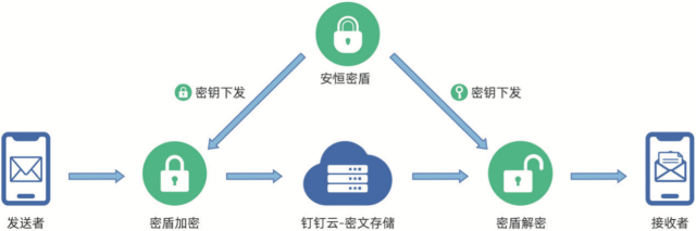 如何保障远程办公信息安全?安恒密盾通过独立的加解密能力集成到钉钉中,配合独立的密钥管理服务器,对远程办公时即时通讯端的信息(文字、图片、语音、视频等)进行全面加密,确保信息的安全性。