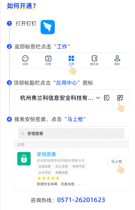 如何开通?钉钉企业用户,只需在钉钉程序内,找到应用,搜索“安恒密盾”,点击“马上抢”,即可免费使用。