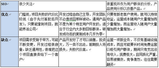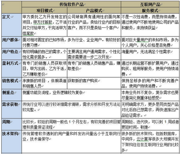 为了便于下文的理解,在分析之前首先说几个概念:“传统软件项目”、“传统软件产品”、“互联网软件产品”,见下表: