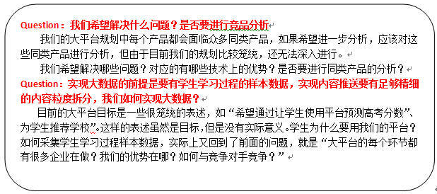 用户没有细分:初中、高中、大学这个群体太庞大,没有细分人群定位;产品定位不清: 暂且不说具体需求,体制内和体制外完全是不同的应用场景;业务范围模糊:以成绩为主线,能和成绩沾边的业务实在太多;总之,客观的说,老大对于产品和项目的区别、教育范畴的划分、大数据实现的过程并不清楚。