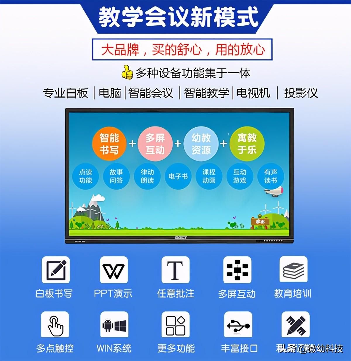 微幼科技的触控教学一体机采用的液晶面板为1080P,可以实现4K高清分辨率,视角可以达到178度,满足左右两边学生看白板的角度需求。同时拥有高对比度和高亮度,不受外部光线影响,满足后面学生可以清晰地观看到屏幕内容的需求。这种互动教学一体机是集电脑、平板、投影、音响、白板等于一体的电子产品,不需要投影仪,即可直接使用。