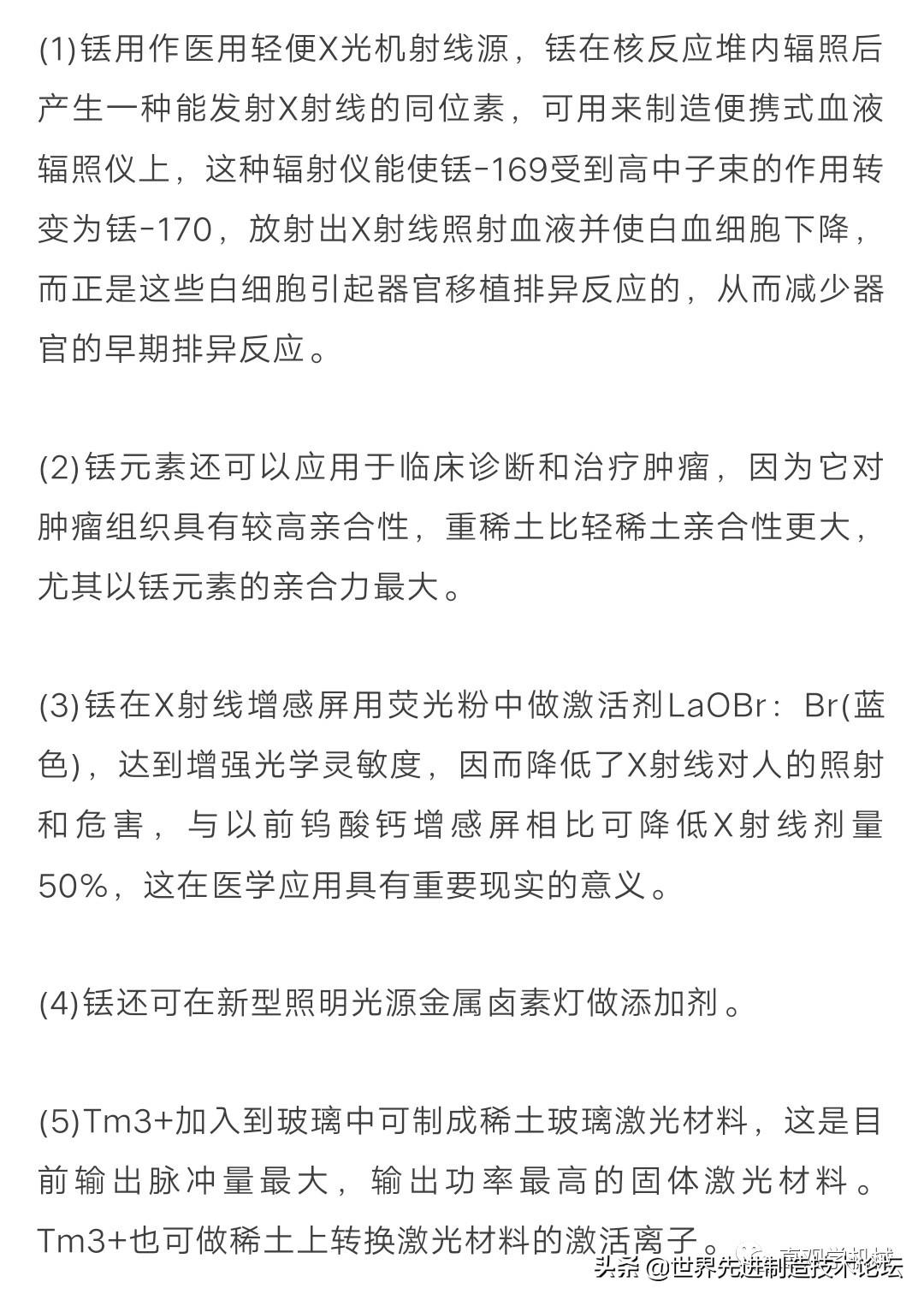 (1)铥用作医用轻便X光机射线源,铥在核反应堆内辐照后产生一种能发射X射线的同位素,可用来制造便携式血液辐照仪上,这种辐射仪能使铥-169受到高中子束的作用转变为铥-170,放射出X射线照射血液并使白血细胞下降,而正是这些白细胞引起器官移植排异反应的,从而减少器官的早期排异反应。