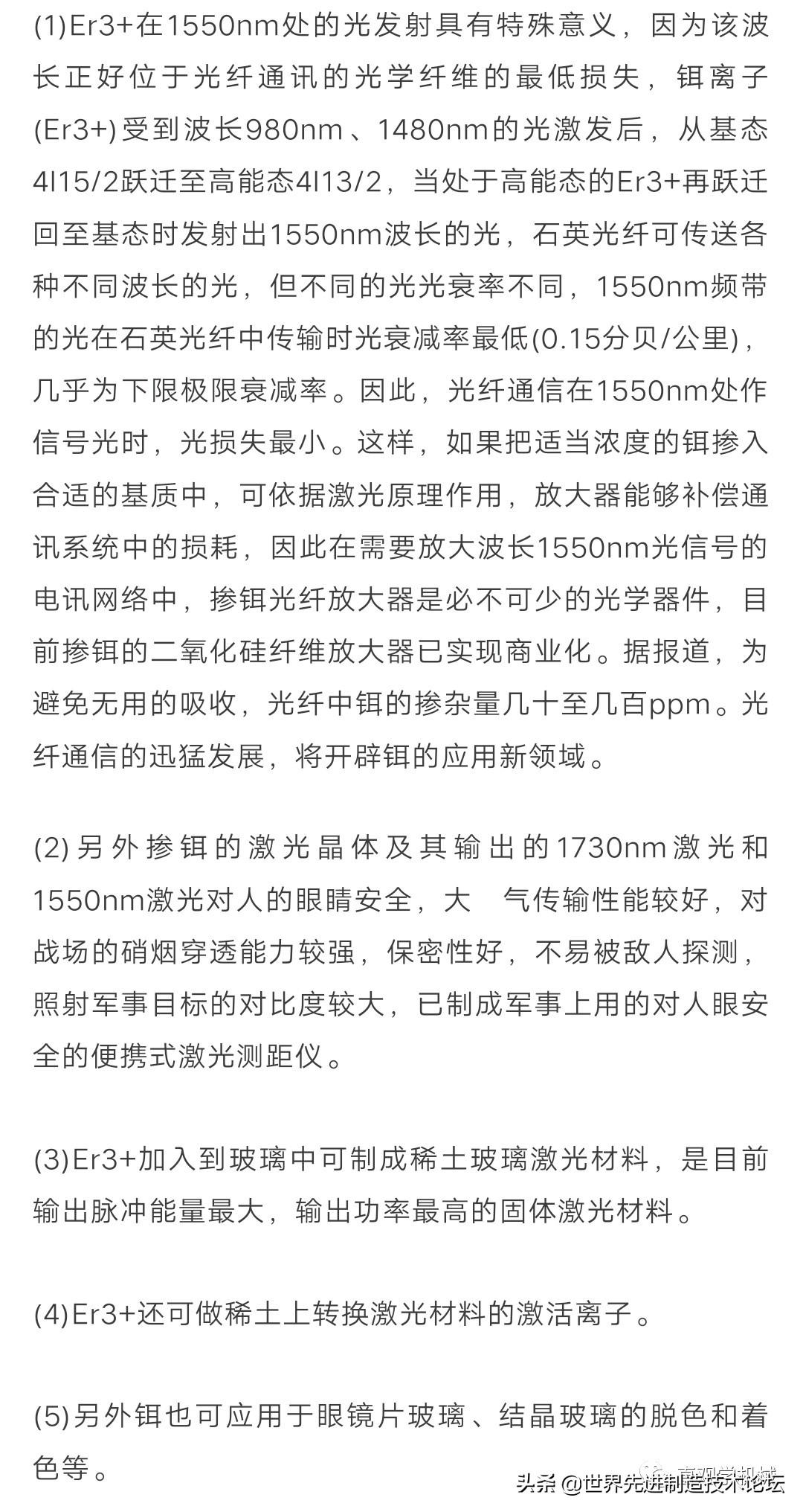 (1)Er3+在1550nm处的光发射具有特殊意义,因为该波长正好位于光纤通讯的光学纤维的最低损失,铒离子(Er3+)受到波长980nm、1480nm的光激发后,从基态4I15/2跃迁至高能态4I13/2,当处于高能态的Er3+再跃迁回至基态时发射出1550nm波长的光,石英光纤可传送各种不同波长的光,但不同的光光衰率不同,1550nm频带的光在石英光纤中传输时光衰减率最低(0.15分贝/公里),几乎为下限极限衰减率。因此,光纤通信在1550nm处作信号光时,光损失最小。这样,如果把适当浓度的铒掺入合适的基质中,可依据激光原理作用,放大器能够补偿通讯系统中的损耗,因此在需要放大波长1550nm光信号的电讯网络中,掺铒光纤放大器是必不可少的光学器件,目前掺铒的二氧化硅纤维放大器已实现商业化。据报道,为避免无用的吸收,光纤中铒的掺杂量几十至几百ppm。光纤通信的迅猛发展,将开辟铒的应用新领域。