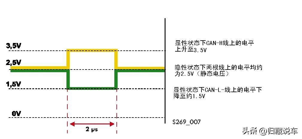 CAN2.0A/B标准规定:总线空闲时,CAN_H和CAN_L上的电压为2.5V在数据传输时:显性电平(逻辑 0):CAN_H 3.5V CAN_L 1.5V隐性电平(逻辑 1):CAN_H 2.5V CAN_L 2.5V