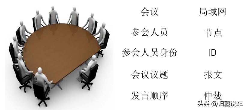 跟其他总线一样,CAN总线的通信也是通过一种类似于“会议”的机制实现的,只不过会议的过程并不是由一方(节点)主导,而是,每一个会议参加人员都可以自由的提出会议议题(多主通信模式),二者对应关系如下: