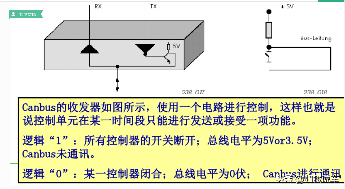 (15)总线值(Bus value):总线可以具有两种互补的逻辑值之一:“显性”(可表示为逻辑0)或“隐性”(可表示为逻辑1)。