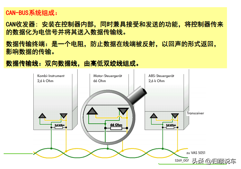 CAN控制器:接收在控制单元中的微处理器中的数据,处理数据并传给CAN收发器。同时,控制器接收收发器的数据,处理并传给微处理器。CAN收发器:是一个发送器和接收器的组合。它将CAN控制器提供的数据转化为电信号并通过数据线发送出去。同时,它接收数据,并将数据传到CAN控制器。数据传输终端:是一个电阻。阻止数据在传输终了被反射回来并发生反射波,这将破坏数据。数据传输线:用以传输数据的双向数据线。分为CAN高位数据线和CAN低位数据线。每个控制器都集成了微处理器、CAN控制器、CAN收发器。它们又被称作CAN网络节点。数据传输线有双绞线、同轴电缆或光纤。车辆多使用双绞线。