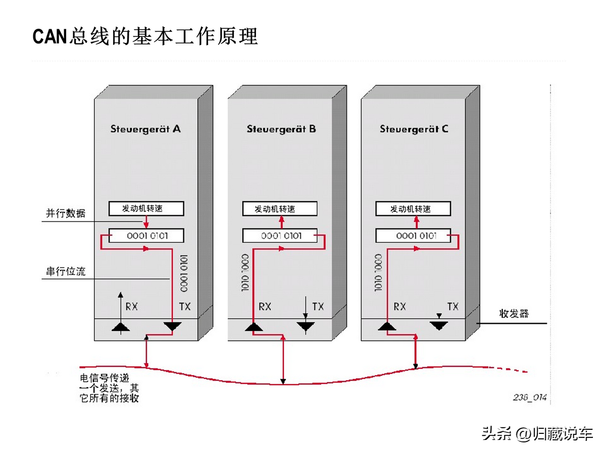 1、多个控制单元以并联方式经收发器与总线连接。2、每个控制单元都有权向总线发送信息(多主处理器结构)。3、同一时刻只有一个控制单元向总线发送信息。其它的控制单元接收信息,其中一些控制单元对这些数据感兴趣并采用这些数据,而另一些控制单元则可能不理会这些数据。