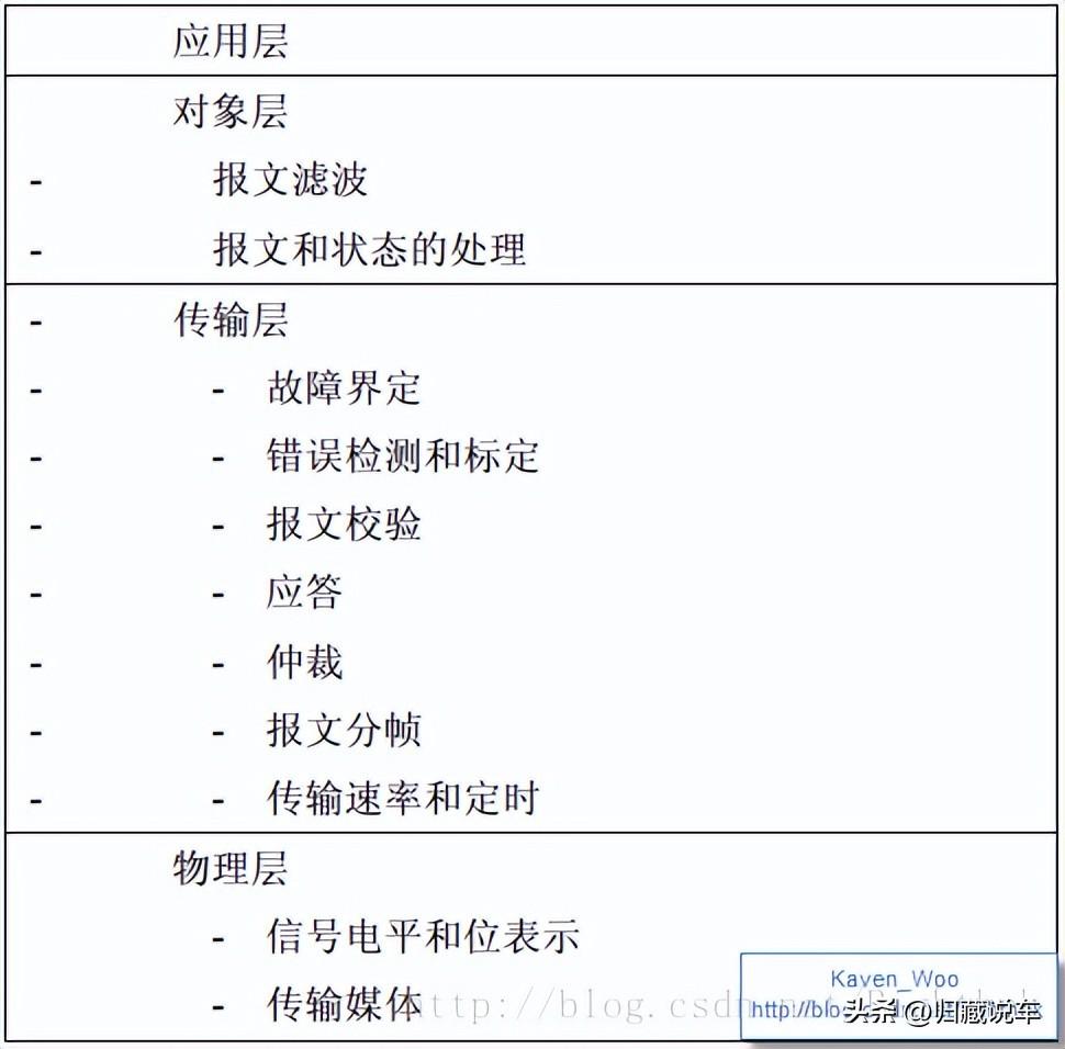 (1)传送规则,也就是控制帧结构、执行仲裁、错误检测、出错标定、故障界定。