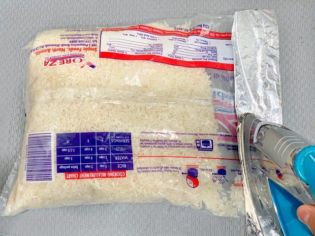 袋装的食品吃剩下不及时保存起来容易变质,为了避免食材接触空气而受潮,我们可以使用锡箔纸和熨斗来从新密封起来,只要在袋口处放上锡箔纸,再用熨斗熨烫一下就能形成一个简易版的封口器。