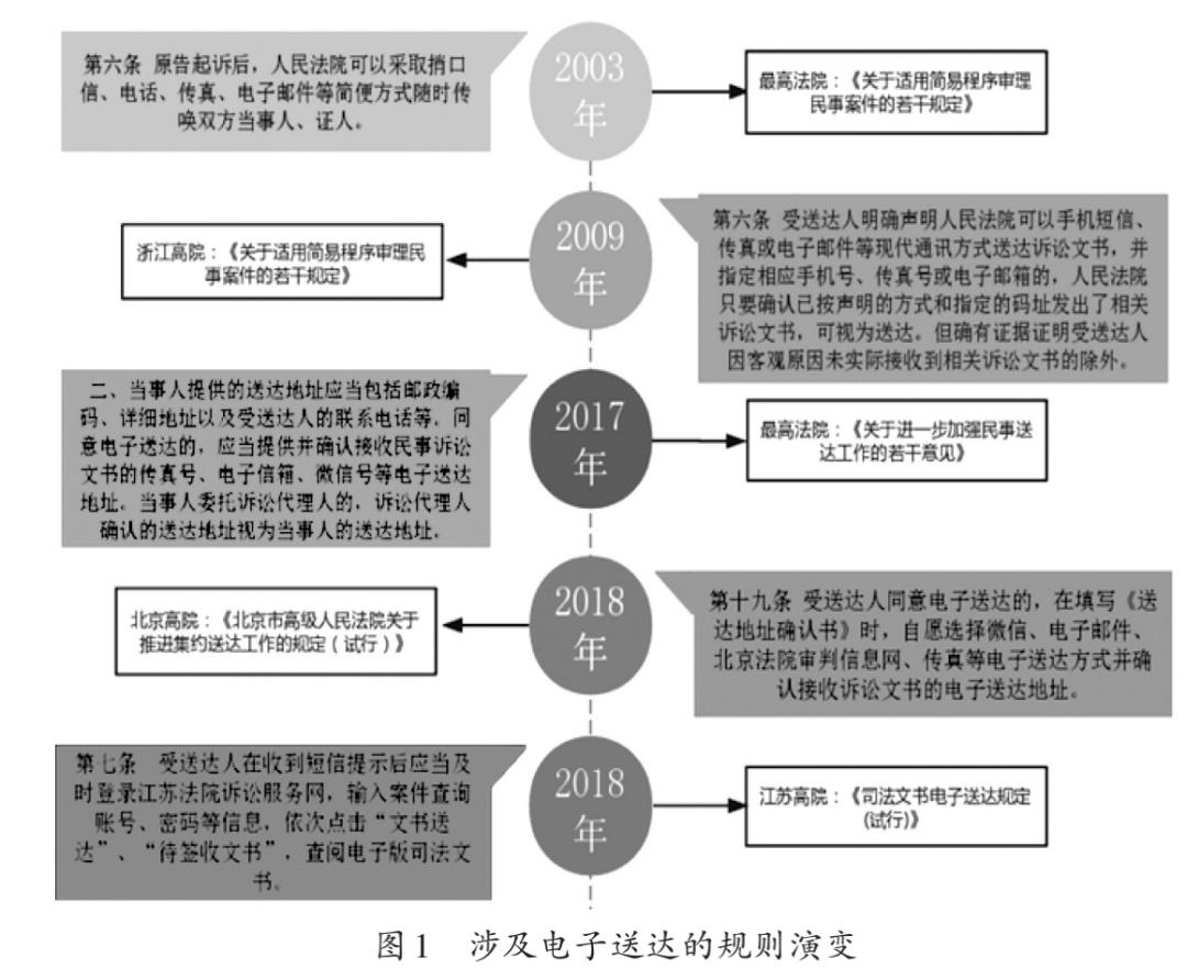 技术的发展为司法带来了变革。根据电子科技应用于诉讼活动的环节数量,国内的电子诉讼实践可分为两种实践模式:一类为“阶段性模式”;另一类为“全程性模式”。具体而言,阶段性模式指的是在诉讼的某个具体环节或阶段引入信息化技术手段,其着重点为单一阶段或者部分单一阶段的集合。而全程性模式指的将在整个诉讼过程全程引入电子科技,进而最终形成具有综合性和系统性的电子诉讼制度。从上述分类来说,笔者所讨论的电子送达为民事诉讼中的一个环节,近年来建立的互联网法院即为全程性模式的典例,然从我国现阶段的信息化技术水平而言,全部实现全程性模式道阻且长。近年来,最高人民法院包括各地高院对于在诉讼中引入阶段性模式的电子送达制定了一系列规则,图1列举了最高院及部分代表地区制定的电子送达规则。