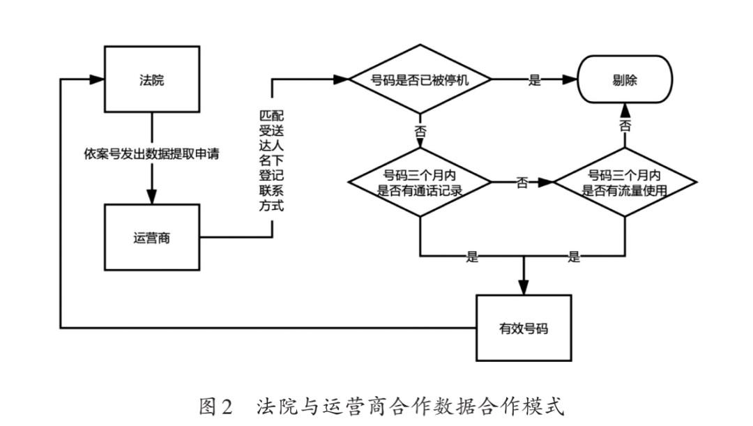 法院可与移动、联通等运营商合作共享信息,目前,我国手机号码基本实现实名制,将当事人向法院提供的身份信息与移动、电信、联通运营商的登记信息进行对比即确定当事人电话号码,在根据原告提供的信息无法联系上被告时可通过链接运营商提供的数据,再根据活跃度对当事人名下的所有手机号码进行筛选、排序,自动过滤出已被强制停机以及近几个月内没有通话记录的、无上网流量的无效号码,并对经过多重筛选出来的有效号码进行电子送达。具体构建路径可如下图2: