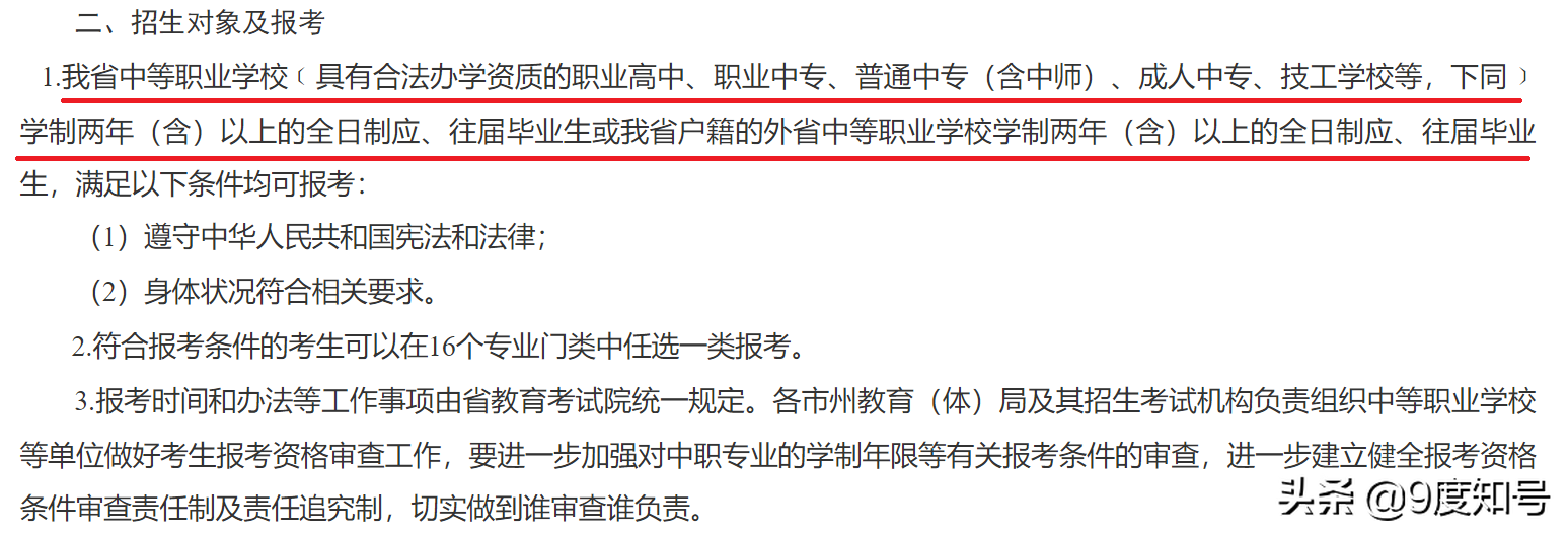 凡湖南中等职业学校(含普通中专、职业高中、技工院校、高职高专院校中职部等,下同)学制两年(含)以上的全日制应、往届毕业生或湖南户籍的外省中等职业学校学制两年(含)以上的全日制应、往届毕业生,可以在16个专业门类中任选一类报考。