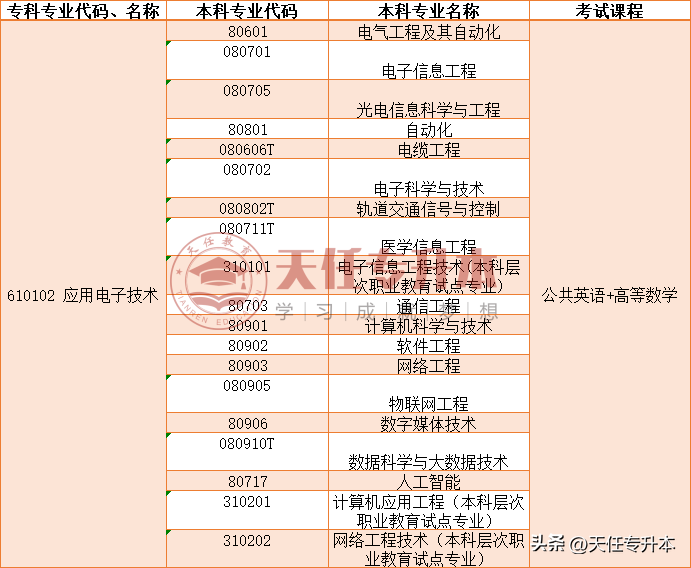 专科读应用电子技术专业,专升本可以学哪些专业?应用电子技术专业专升本对应的本科专业是电气工程及其自动化、电子信息工程、光电信息科学与工程、自动化、电缆工程、电子科学与技术、轨道交通信号与控制、医学信息工程、电子信息工程技术(本科层次职业教育试点专业)、通信工程、计算机科学与技术、软件工程、网络工程、物联网工程、数字媒体技术、数据科学与大数据技术、人工智能、计算机应用工程(本科层次职业教育试点专业)、网络工程技术(本科层次职业教育试点专业),这些专业的考试科目是公共英语和高等数学 。
