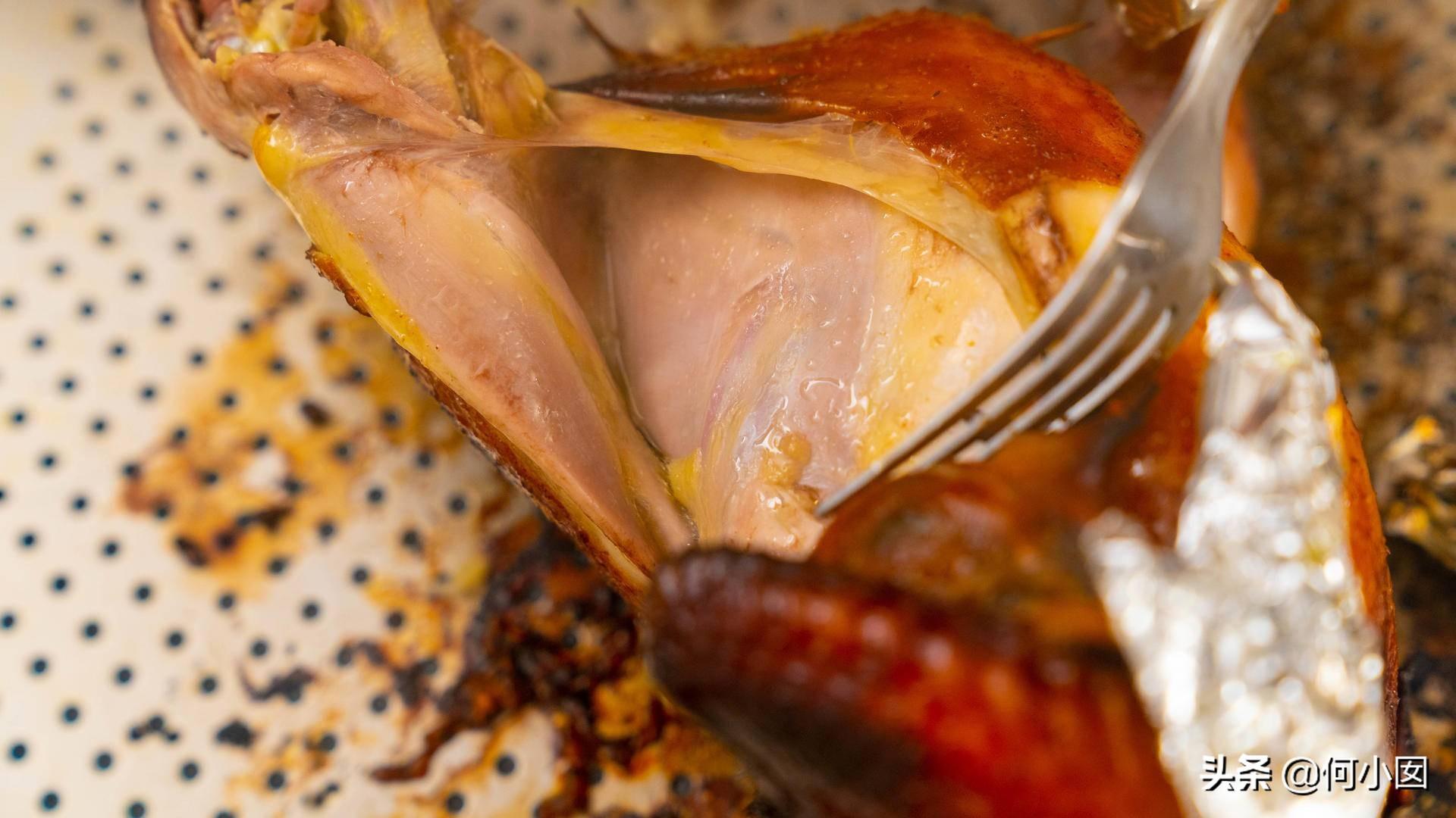 切开看看,这个鸡因为是蒸烤的做法,所以一点都不会干,是很有汁水的