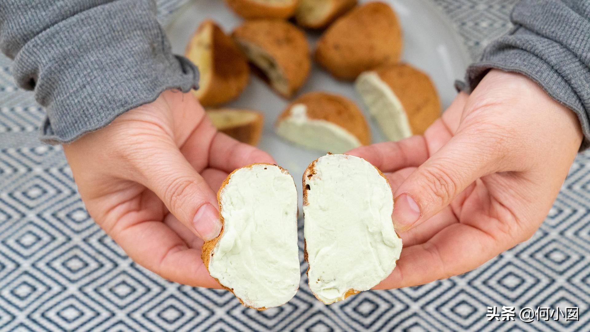 馅儿料:这个随意的,可以用卡仕达,我觉得有些腻了,就用的淡奶油,可以把馅儿做成多种口味的,比如酸奶味、芝士味或者是巧克力味、抹茶味等等,我做的抹茶和原味的,准备抹茶粉5g就行