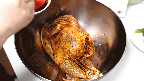 3、腌制好的鸡取出来,用生抽+蜂蜜+料酒的混合液体,全身刷一遍,再腌制2小时左右