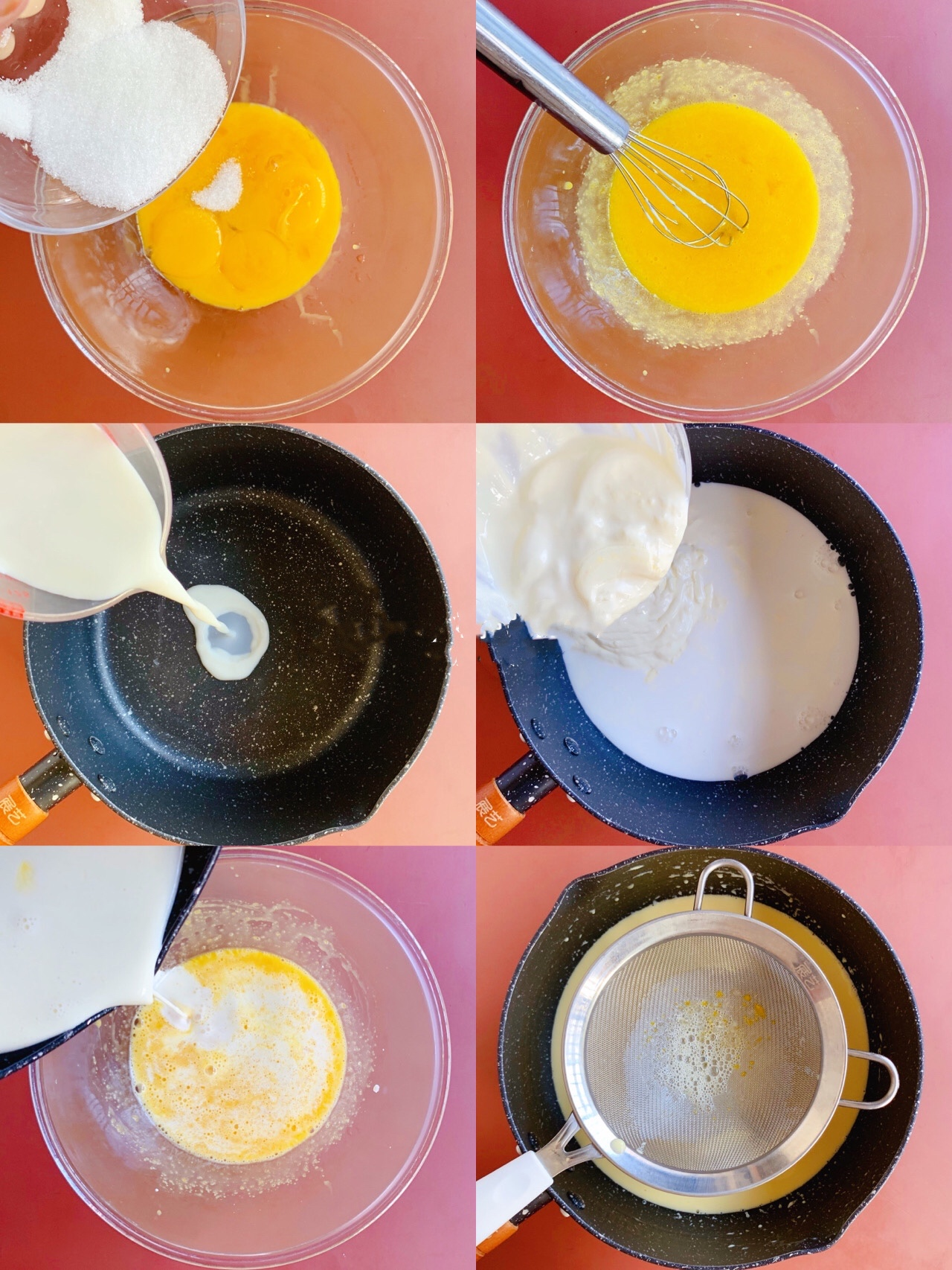 2️⃣纯牛奶+淡奶油拌匀,小火加热至边缘冒小泡泡,一边加入蛋黄中一边搅拌均匀