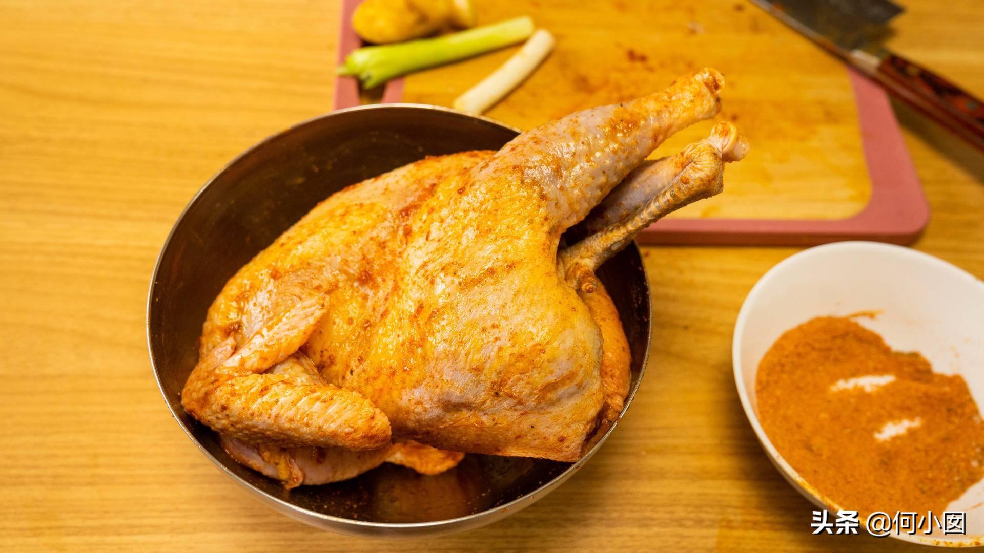 原料:鸡一只,不要选太大太肥的鸡,烤出来会油腻不好吃,也不能选太瘦的,烤出来会比较柴,也不好吃,选一只大概在2.5-3.5斤净重的鸡,最好是活鸡宰杀,如果没有用冷鲜的也可以,不要用冻货,口感不行,鸡让摊位老板处理好,不开膛,做整鸡的,挑选的时候选嫩鸡最好,尽量不要选老鸡、土鸡,会导致蒸的时间太长