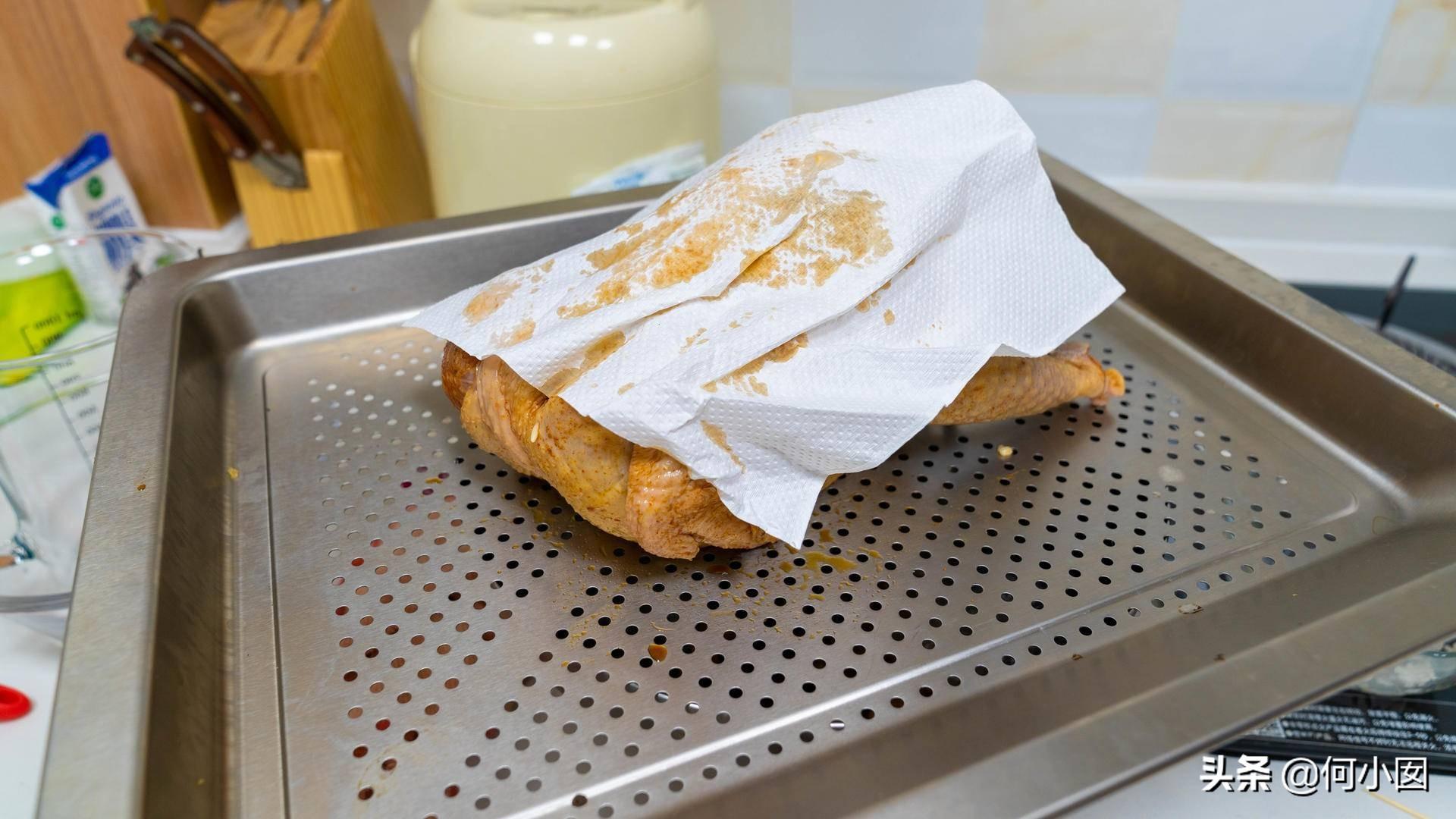 4、2小时候过后取出,用纸巾包一下,吸干鸡身表面多余的液体,这样烤出来皮会脆一些,如果不在意的可以省略这一步