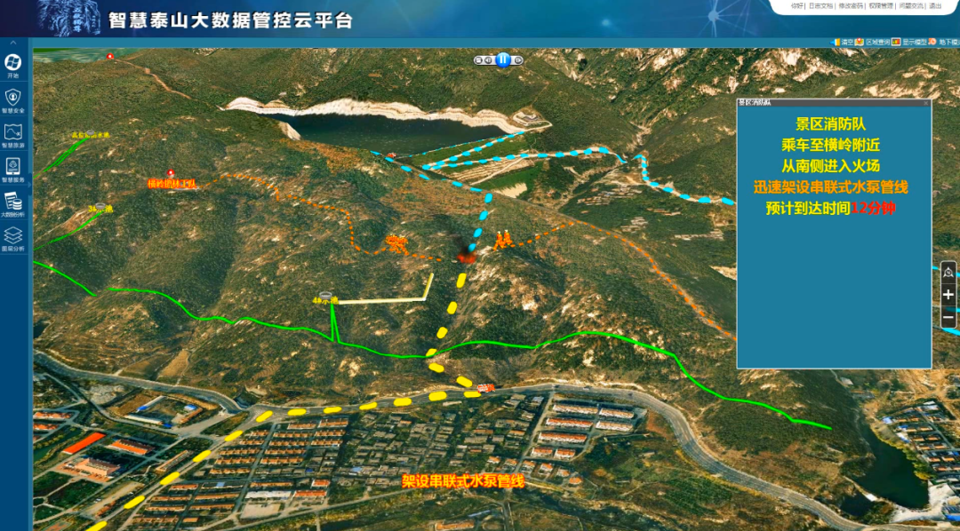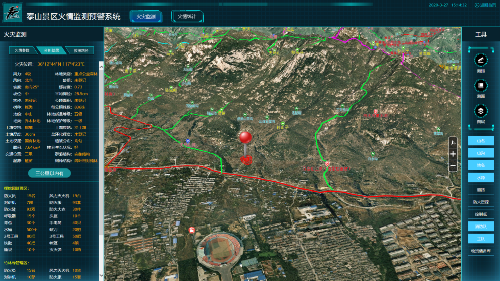 自主研发应急救援指挥车,实现“智慧泰山”各大系统在指挥车上移动应用,成为景区应急救援“流动指挥中心”。建设三维GIS指挥信息平台,结合防火视频监控,实现火点坐标准确定位。系统自动研判启动泰山森林火灾应急救援预案,调配区域范围内突击队员,提示蓄水池和灭火物资情况,自动生成最便捷救援路线。通过北斗卫星、无人机实时跟踪位置和现场火情图像,实现火灾扑救全程智能化、可视化。