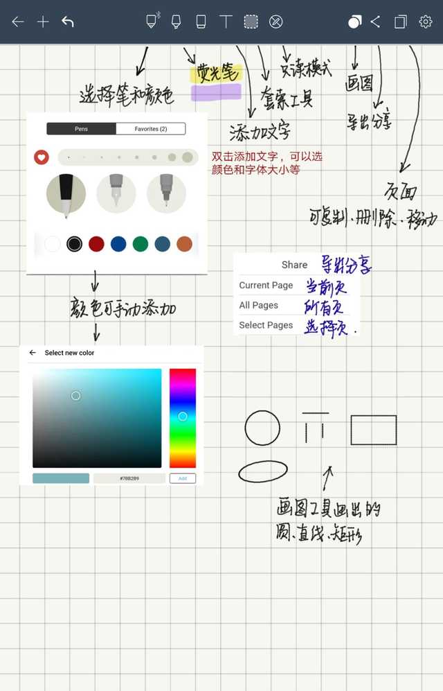 我使用的英文版软件,在顶部有笔触类型,提供铅笔、钢笔和马克笔,同时可以选择颜色和粗细。其它常用的工具还有高亮、橡皮、添加文本编辑、区域选定、只读模式等,右侧是分享和设置的按钮。
