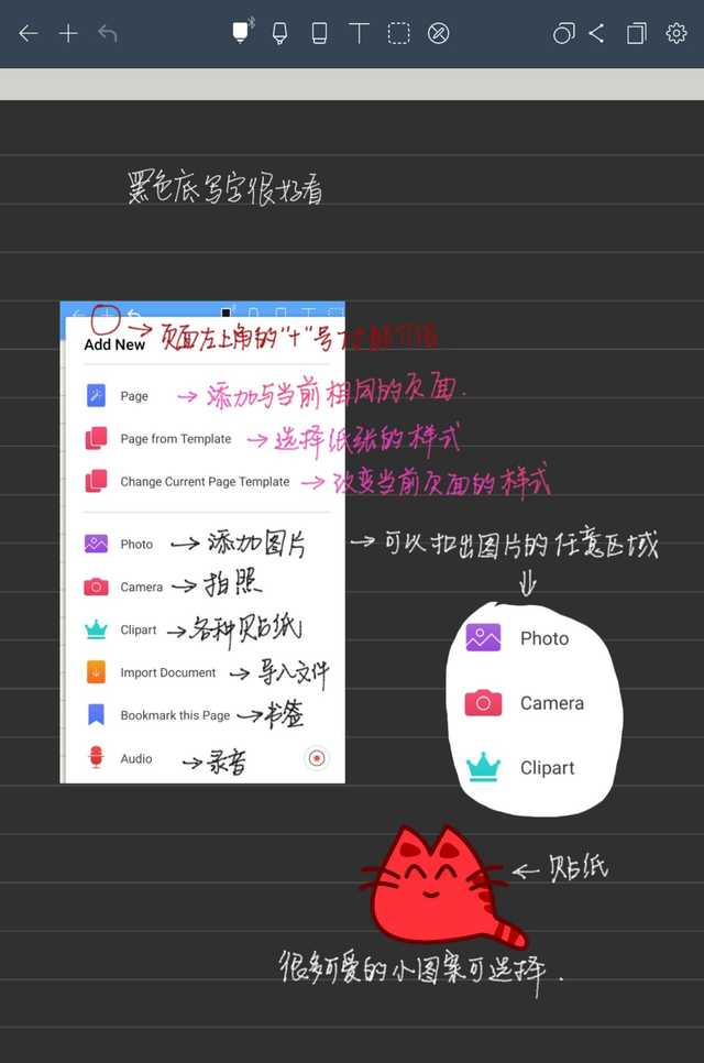 Noteshelf这款笔记软件的强大功能还体现在这个小小的“+”号里面,大家可以添加图片、录音或者导入文件,对办公一族来说,这些功能就更加适合实用了。尤其是进行各种内容创作的时候,很多素材都可以进行混编,完成度十分接近最终的成品。